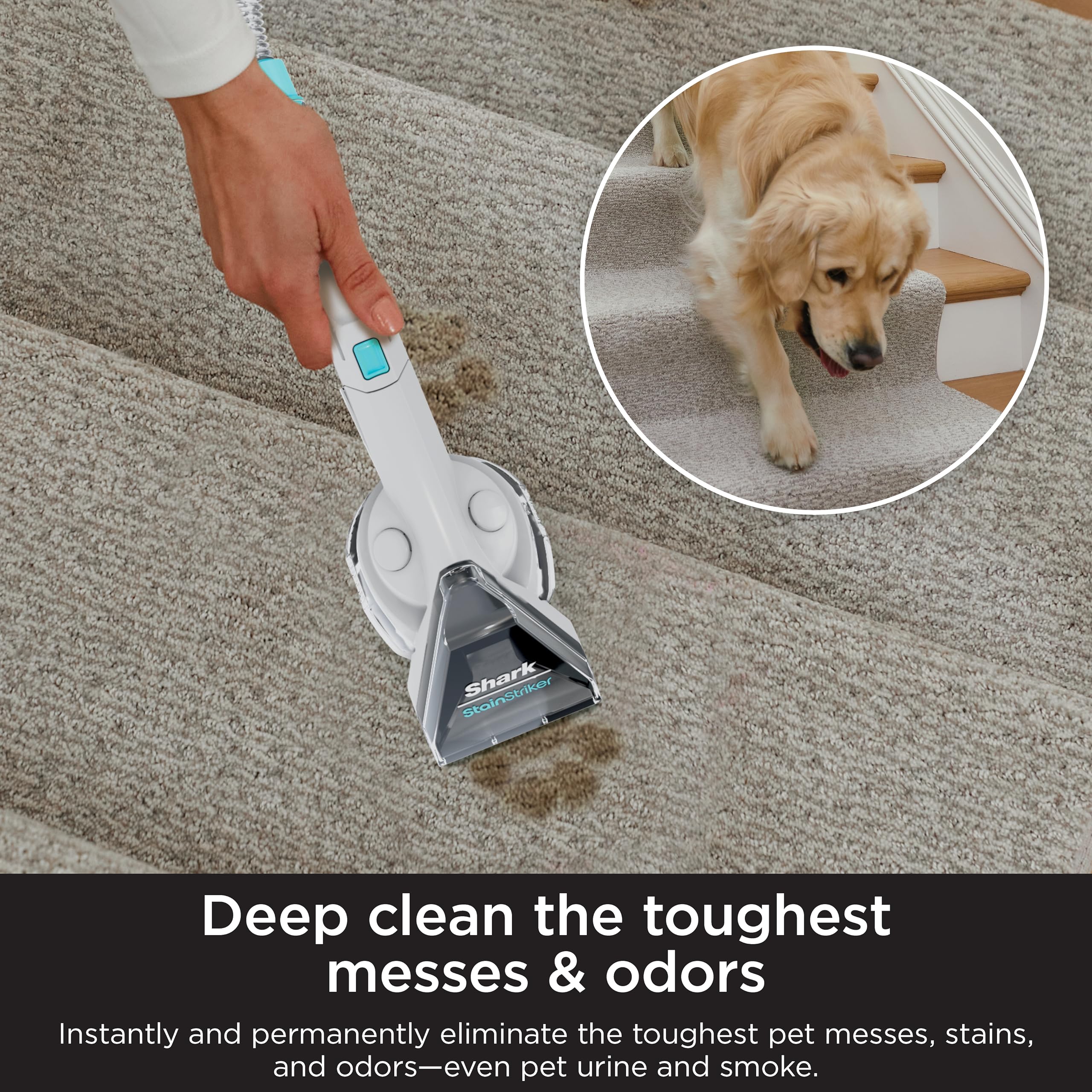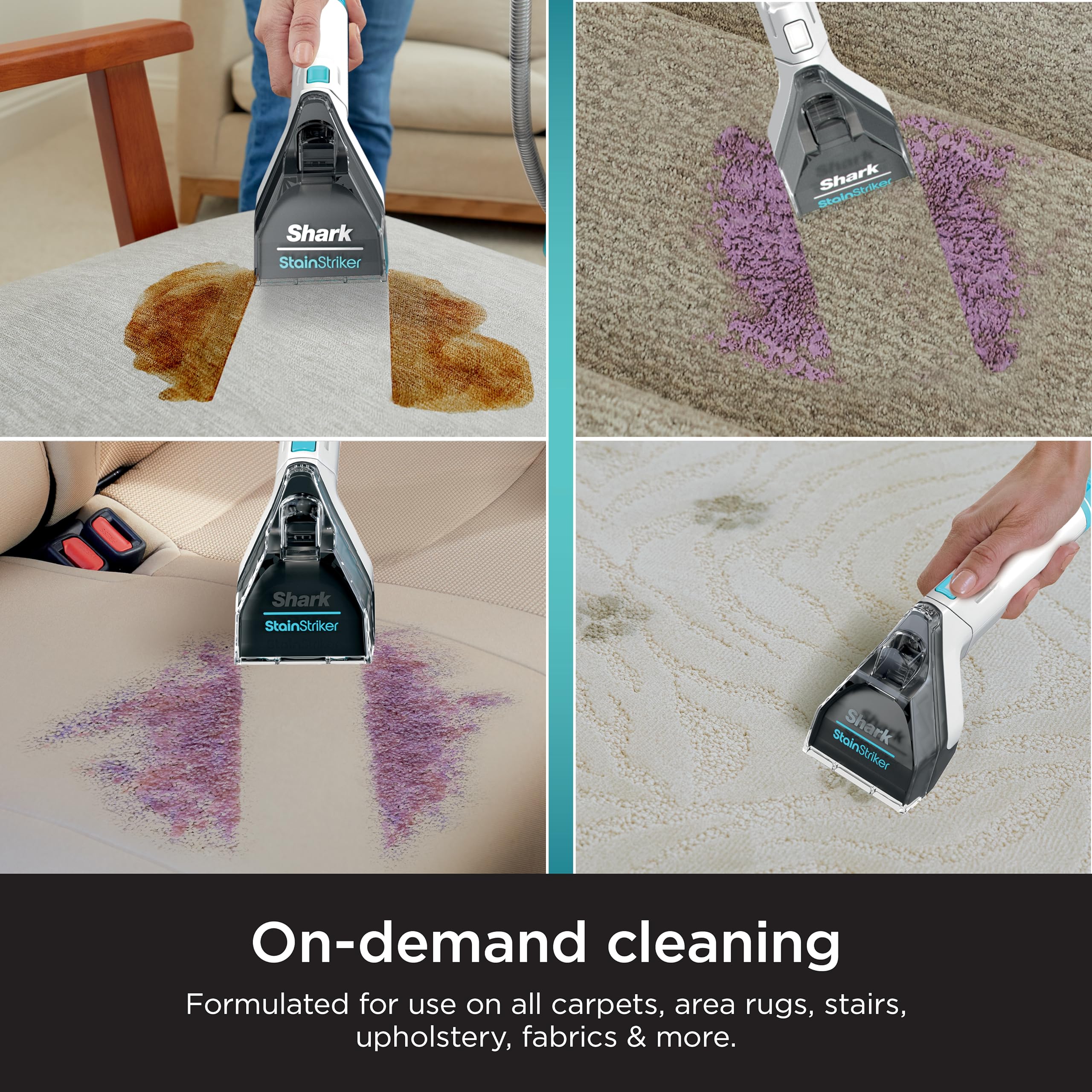 -Compatible con limpiadores portátiles de alfombras Shark StainStriker. -Tecnología StainStriker: dos químicos únicos se mezclan y activan al contacto en la herramienta de mano para liberar el poder de OXY con 20 veces más fuerza de eliminación de manchas.